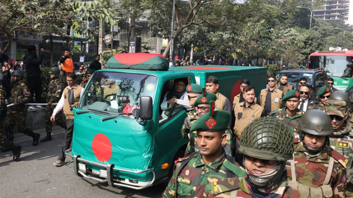 পতাকায় মোড়ানো গাড়িতে মানিক মিয়া অ্যাভিনিউতে নেওয়া হচ্ছে খালেদা জিয়ার মরদেহ